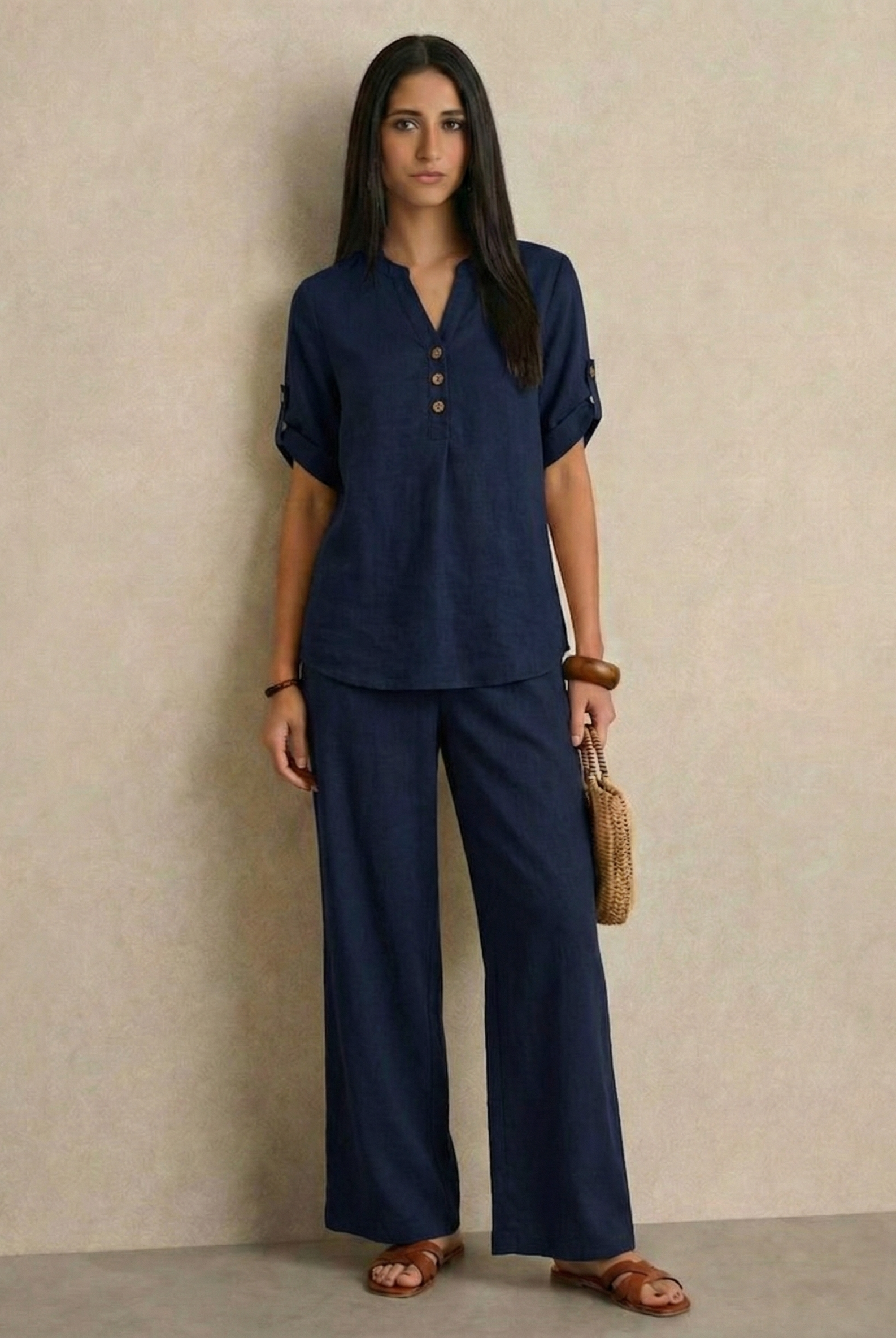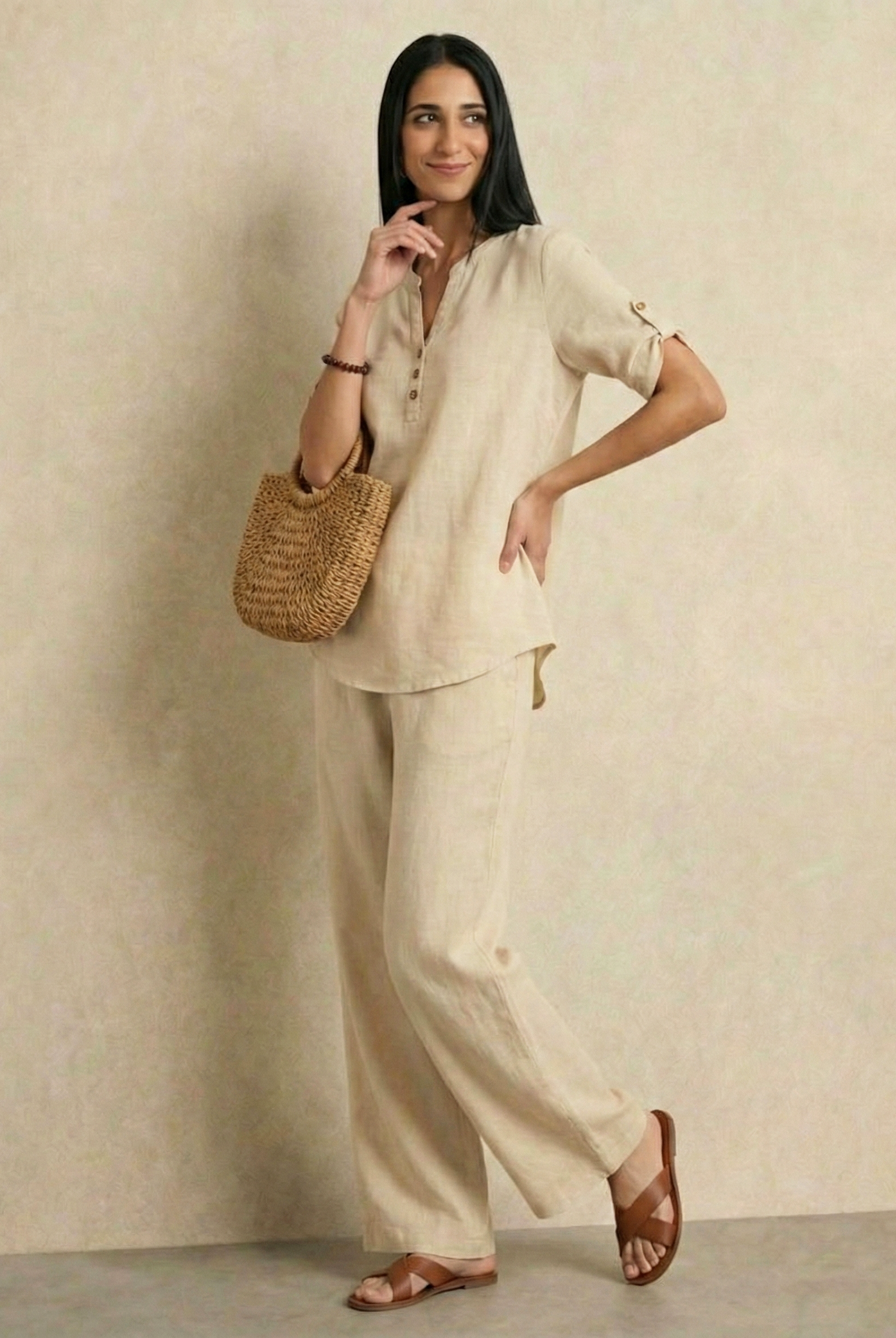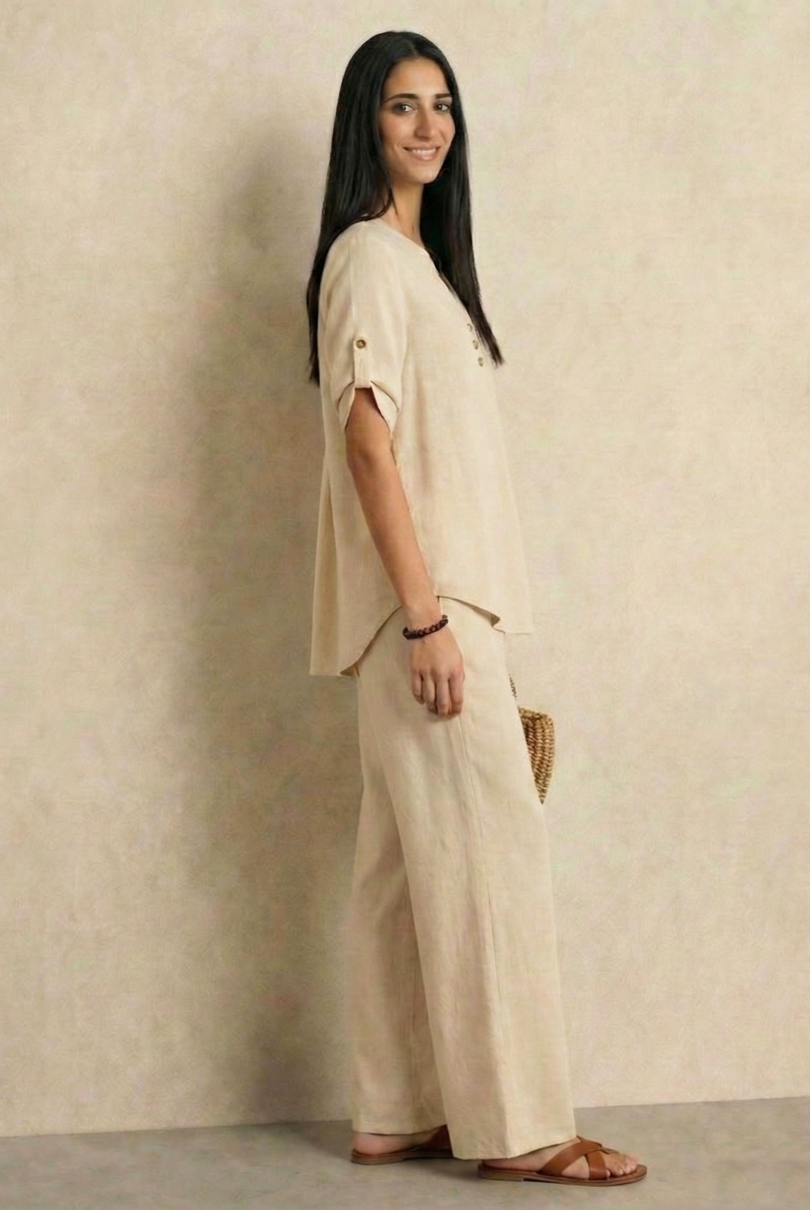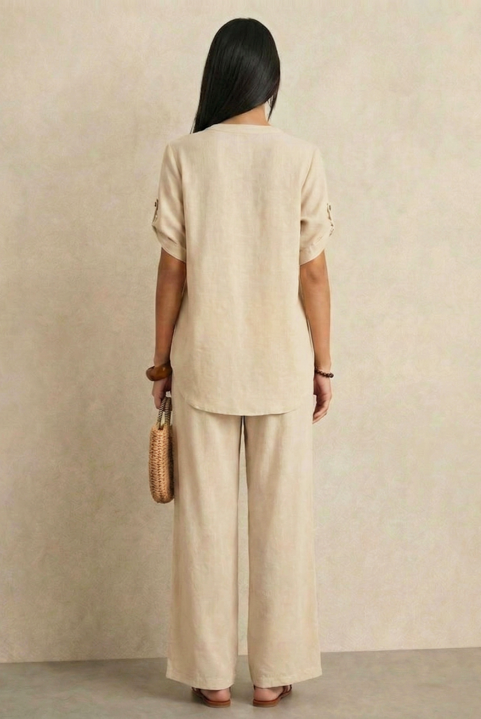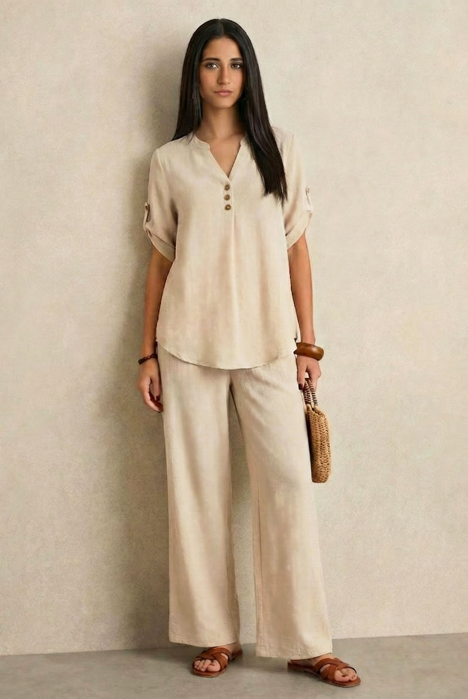 This outfit features a relaxed, short-sleeved button-up top paired with wide-leg trousers, both crafted from lightweight, breathable linen. The earthy tones of taupe and beige exude a natural elegance, making it perfect for warm-weather days or laid-back occasions. The minimalist design and comfortable fit offer both style and ease, making this ensemble a versatile addition to any wardrobe.