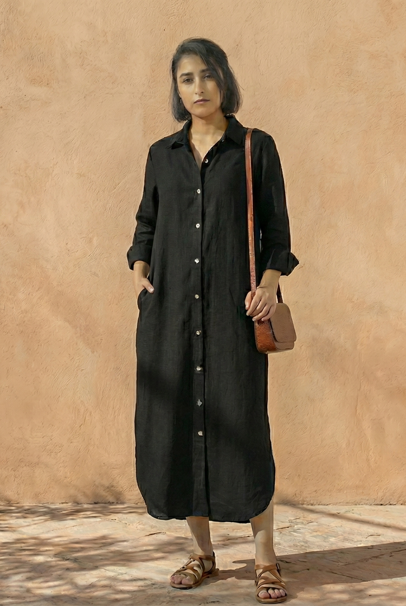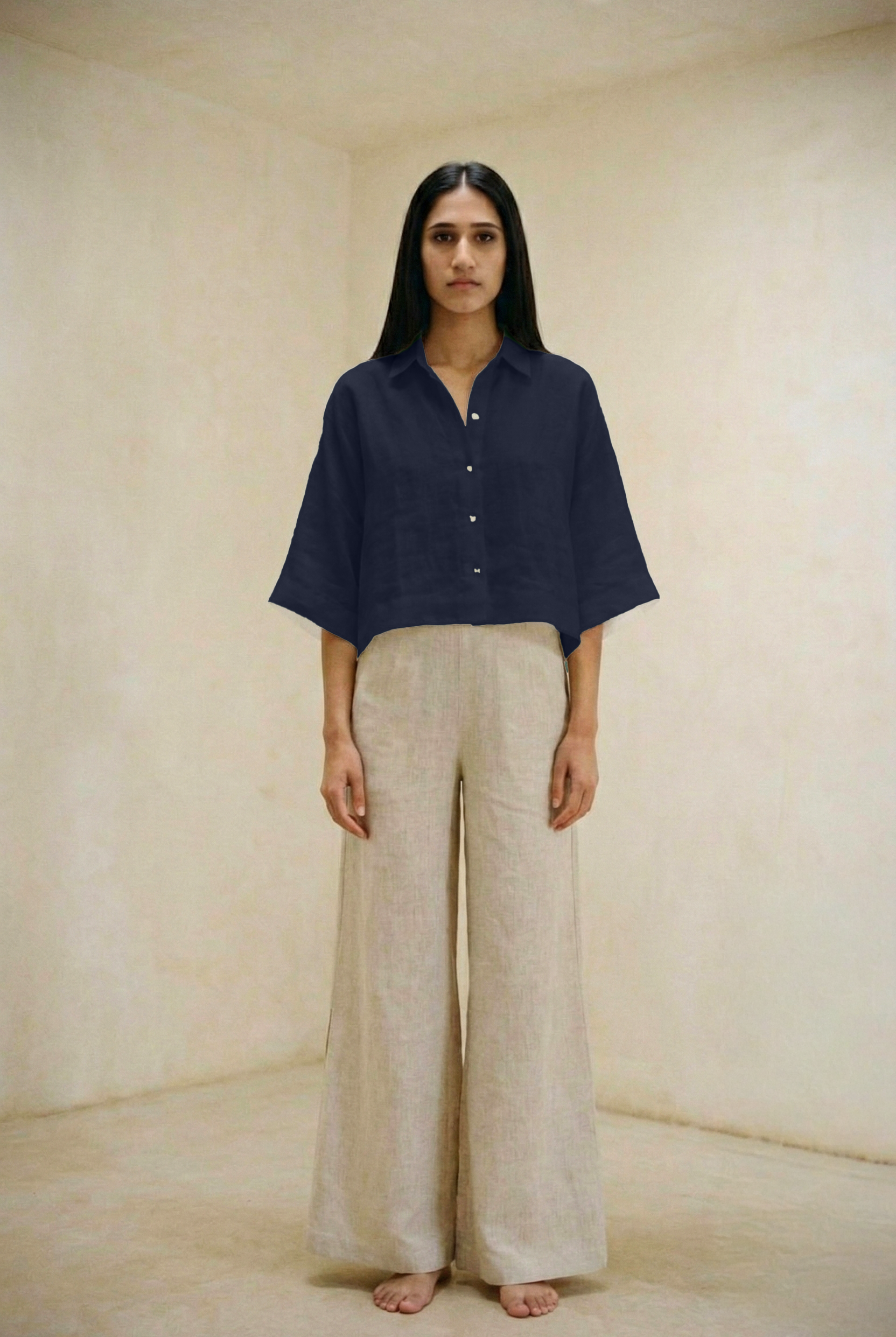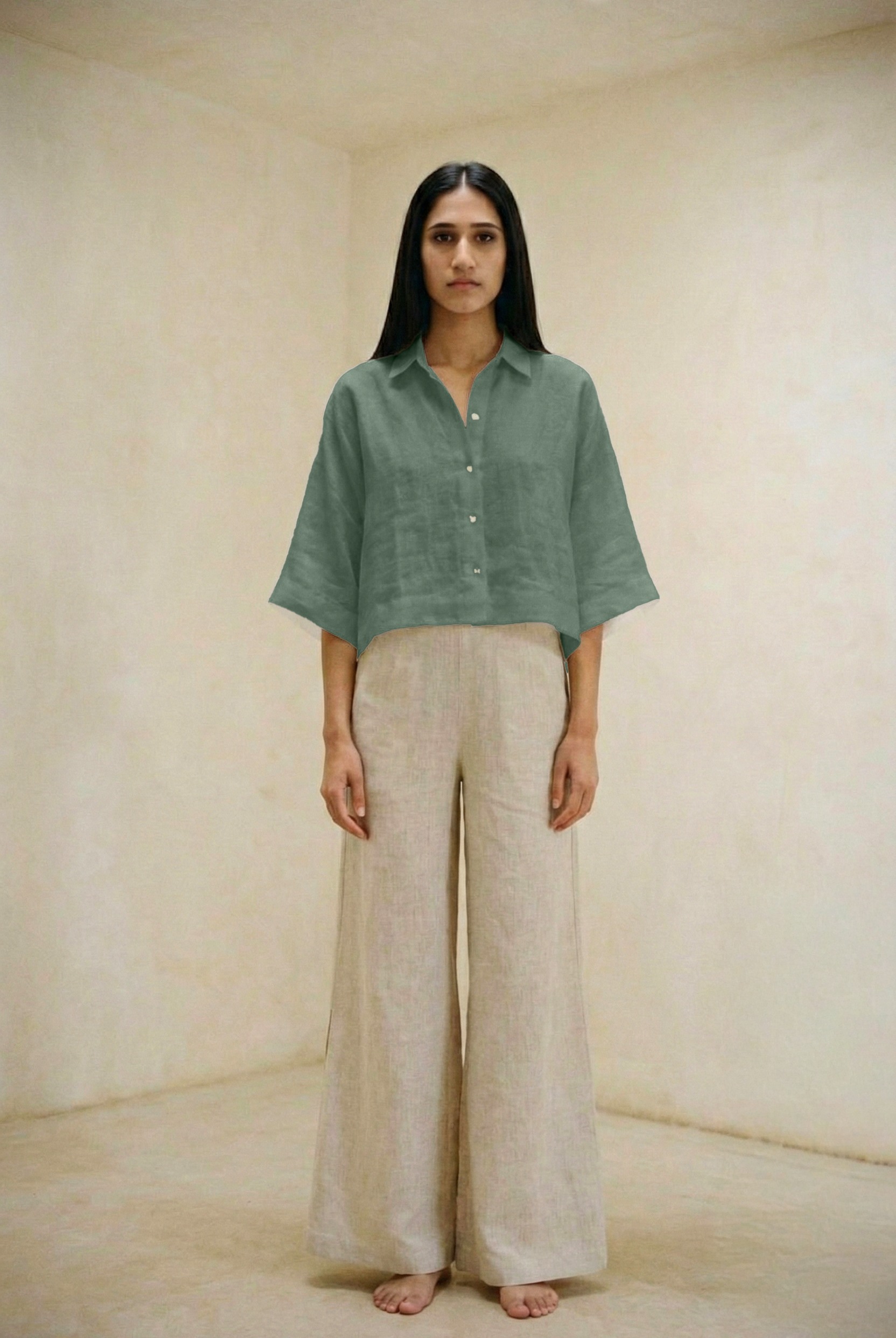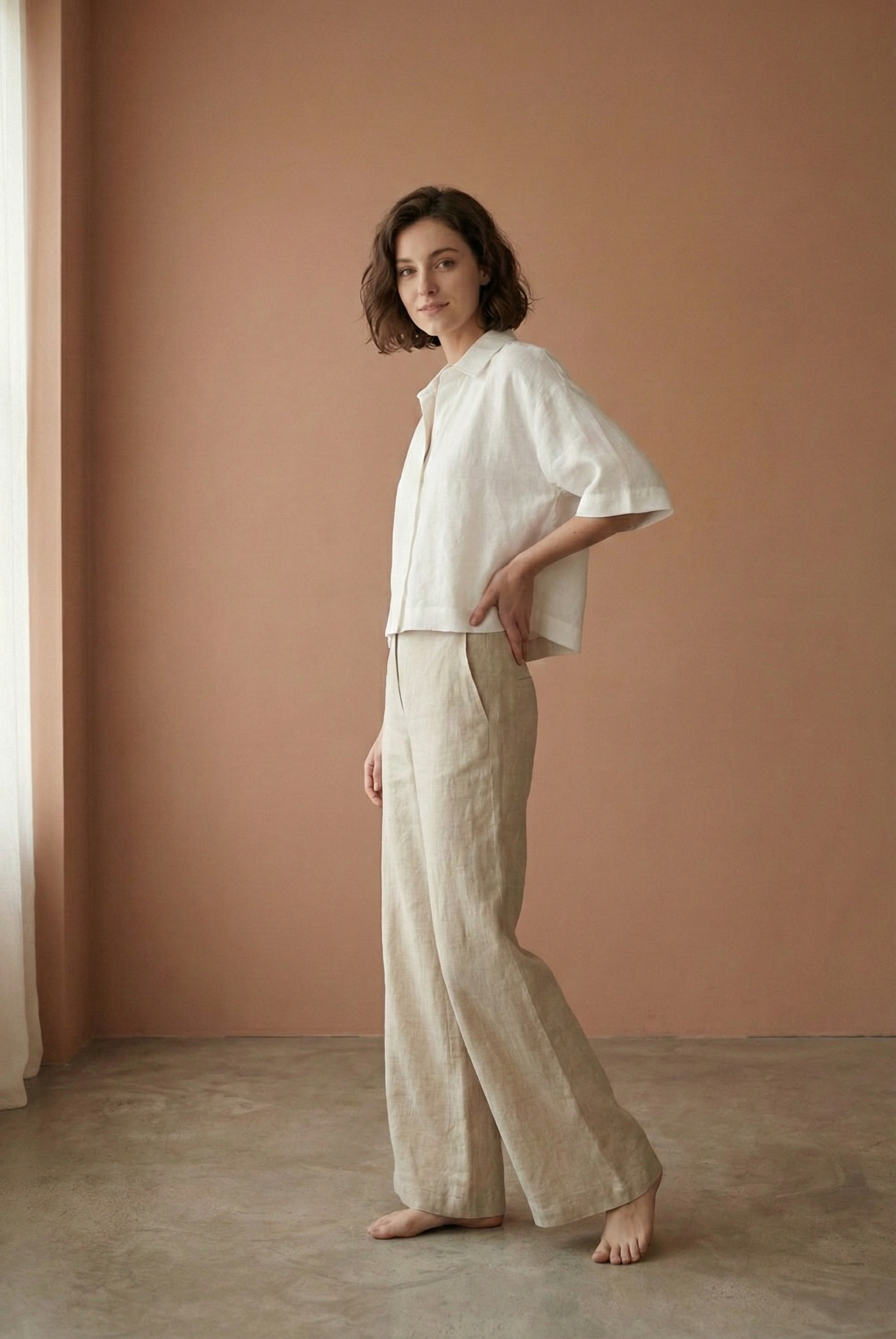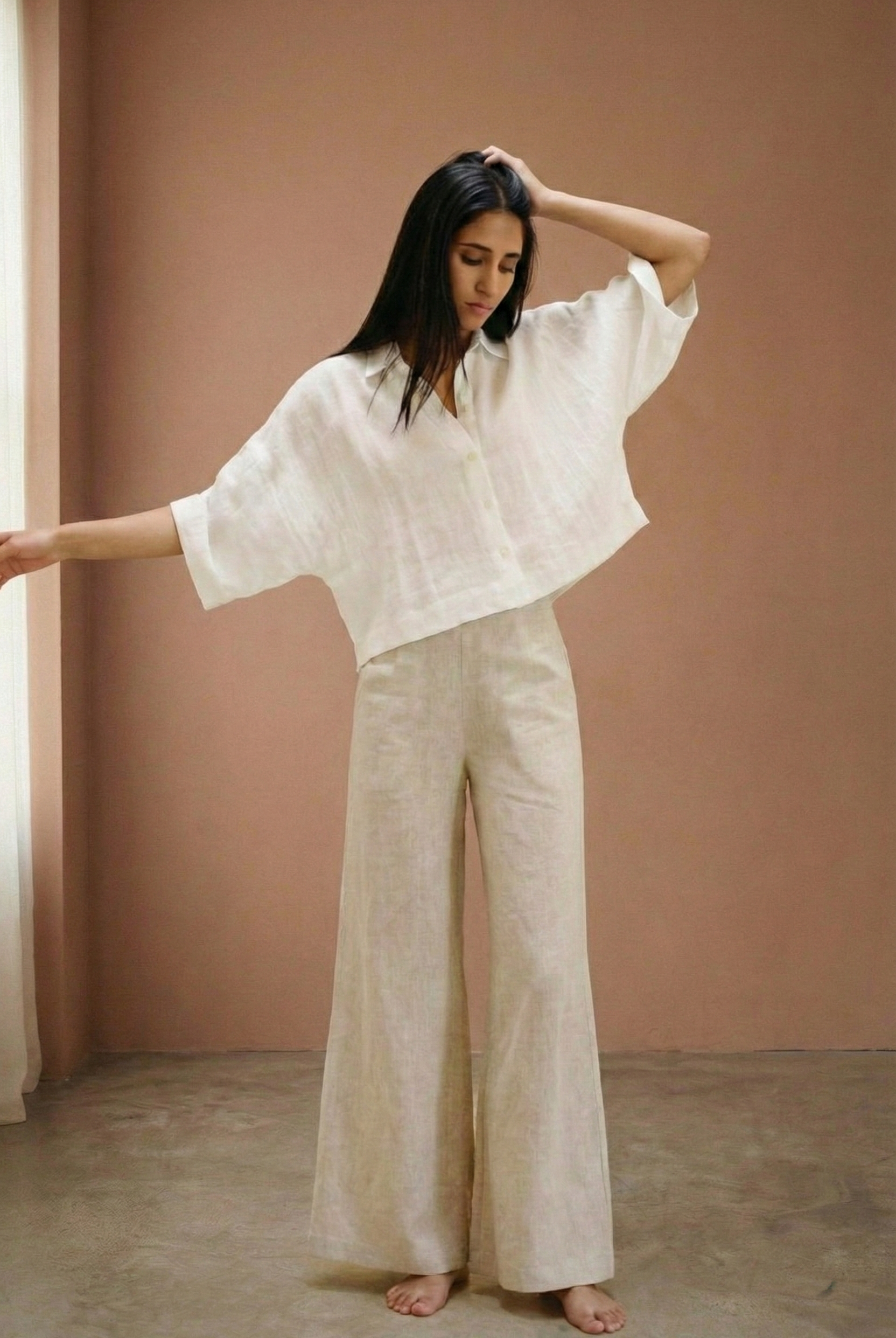 This outfit features a relaxed, short-sleeved button-up top paired with wide-leg trousers, both crafted from lightweight, breathable linen. The earthy tones of taupe and beige exude a natural elegance, making it perfect for warm-weather days or laid-back occasions. The minimalist design and comfortable fit offer both style and ease, making this ensemble a versatile addition to any wardrobe.