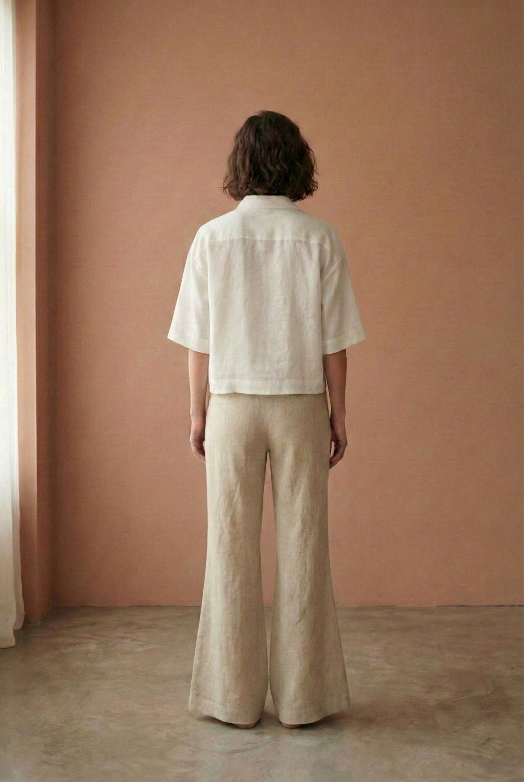 This outfit features a relaxed, short-sleeved button-up top paired with wide-leg trousers, both crafted from lightweight, breathable linen. The earthy tones of taupe and beige exude a natural elegance, making it perfect for warm-weather days or laid-back occasions. The minimalist design and comfortable fit offer both style and ease, making this ensemble a versatile addition to any wardrobe.