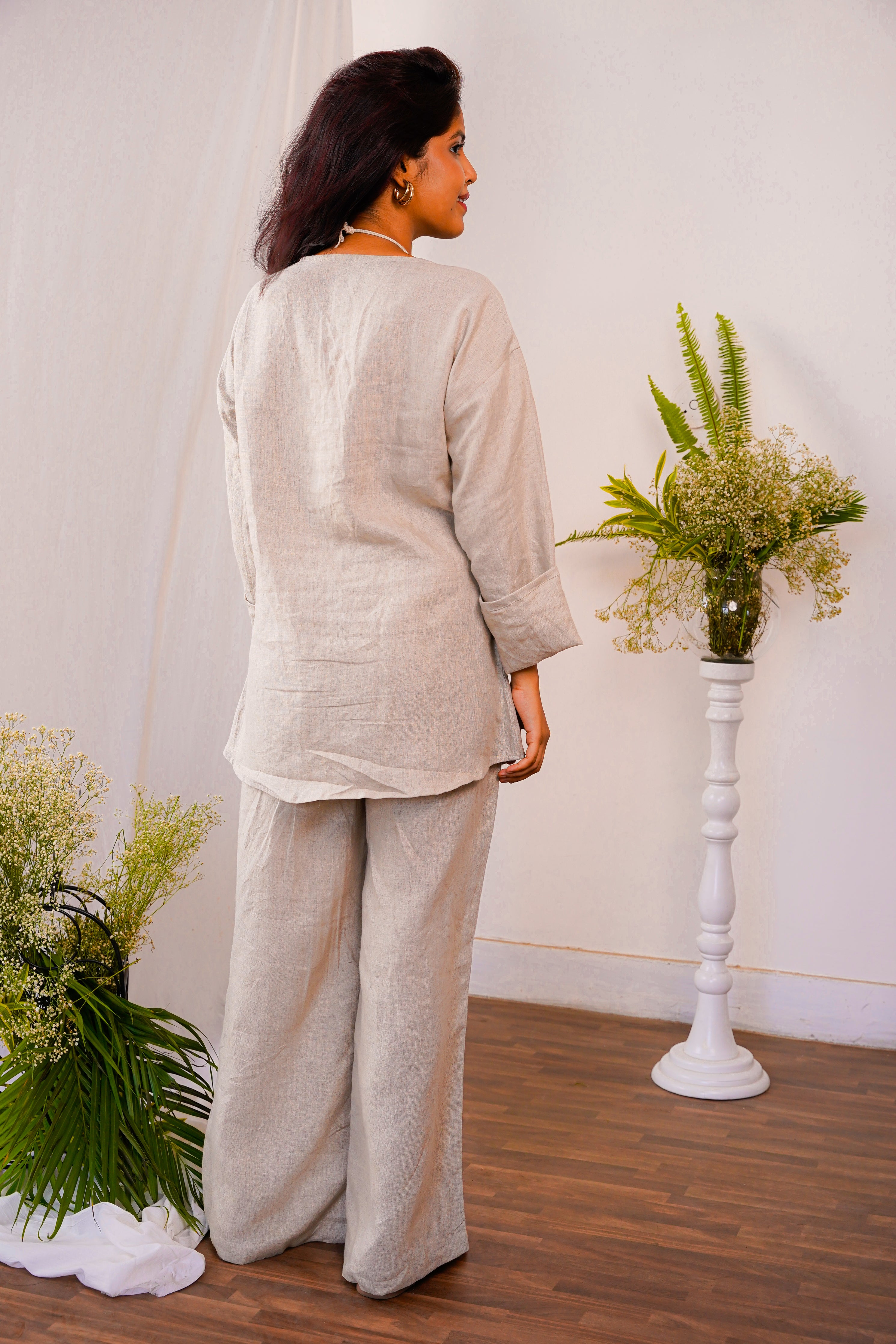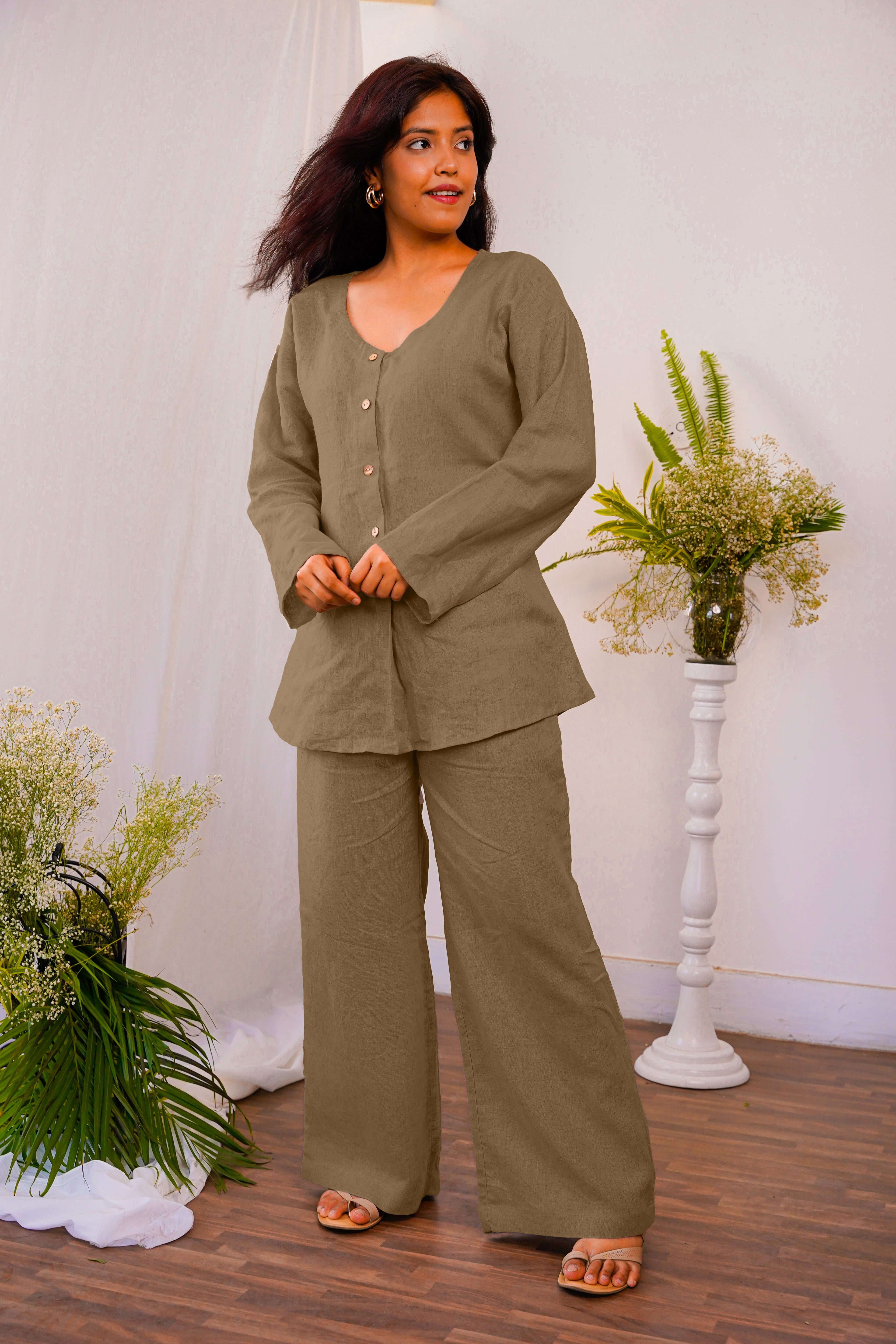 Paired with matching linen bottoms, this co-ord set creates a polished and coordinated look. The pleated pants provides a comfortable and adjustable fit, while the wide leg design adds a touch of elegance and freedom of movement.