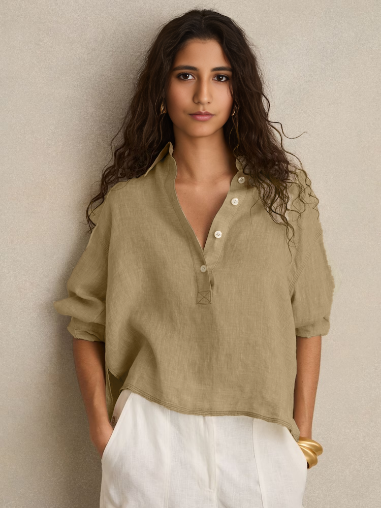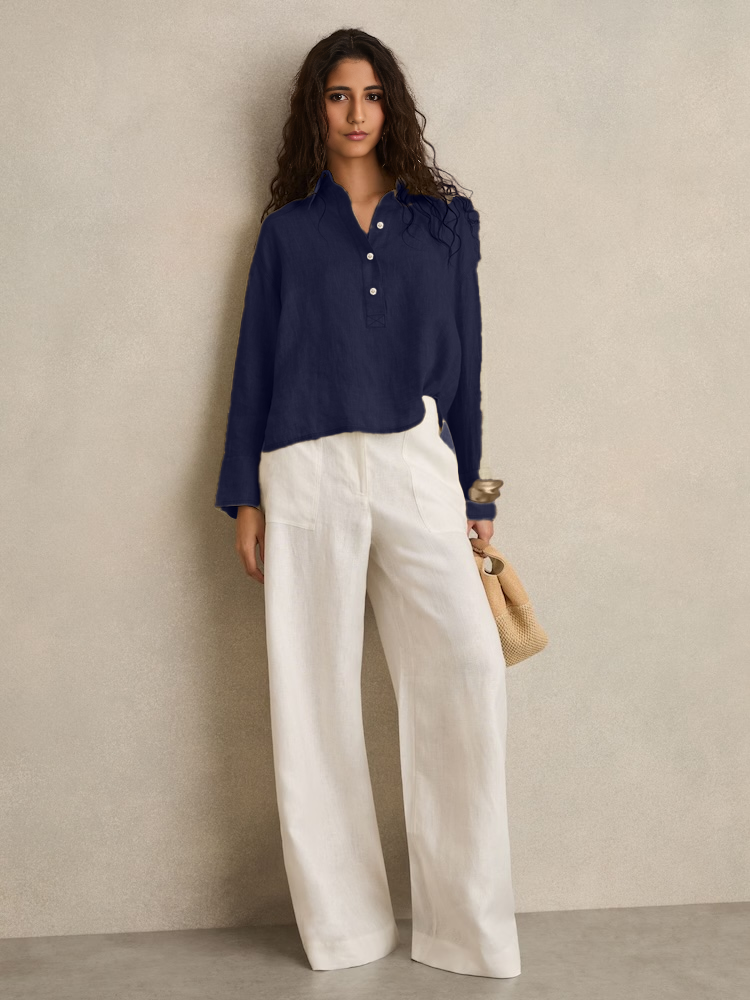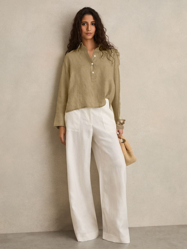 This outfit features a relaxed, full-sleeved half-button-up top paired with wide-leg trousers, both crafted from lightweight, breathable linen. The earthy tones of taupe and beige exude a natural elegance, making it perfect for warm-weather days or laid-back occasions. The minimalist design and comfortable fit offer both style and ease, making this ensemble a versatile addition to any wardrobe.